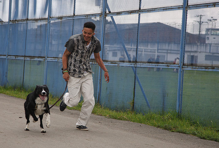 Después de recibir las instrucciones de los guías caninos, los internos hacen carreras con los perros. Es cuando más feliz se les ve; de pronto parece que no están en la cárcel.