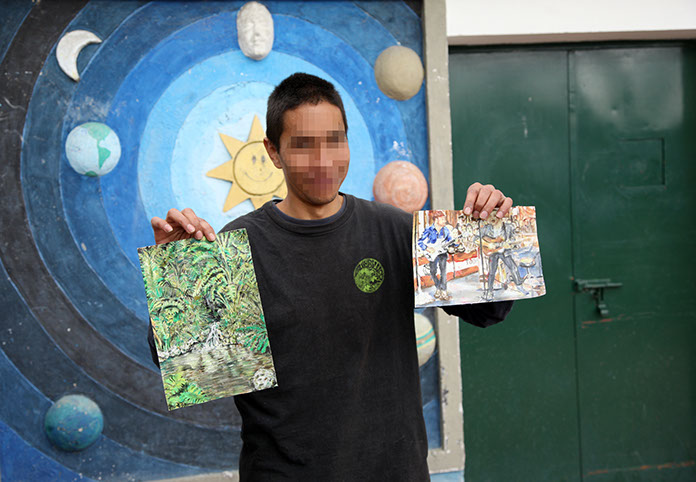 Jonathan Alexander Taborda muestra orgulloso una de sus creaciones en madera elaborada durante la terapia ocupacional, que tiene lugar todas las mañanas de lunes a viernes.