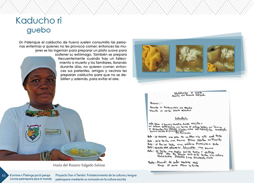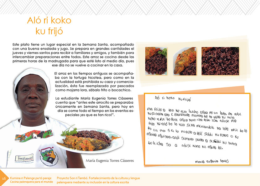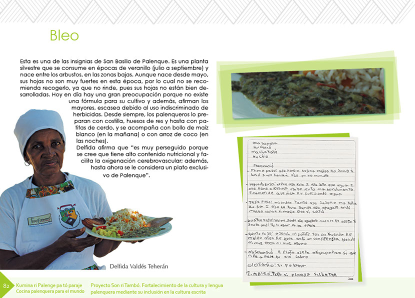El texto, escrito en su lengua nativa y en español, recopiló 38 recetas tradicionales y acaba de ser escogido como finalista en los premios Gourmand World Cookbook Awards 2014, considerados los Oscar de la gastronomía. San Basilio de Palenque, primer pueblo esclavo libre de América, patrimonio de la Humanidad y cuna del excampeón mundial de boxeo Antonio Cervantes Kid Pambelé, ahora tiene uno de los diez mejores libros de cocina del mundo.
