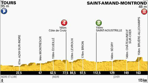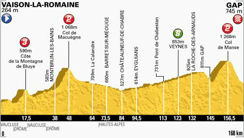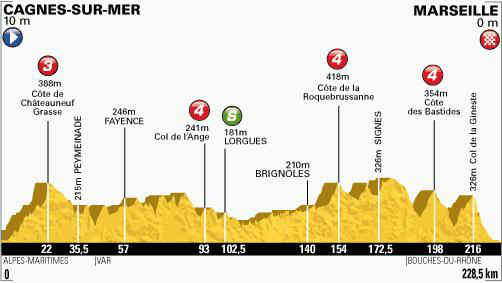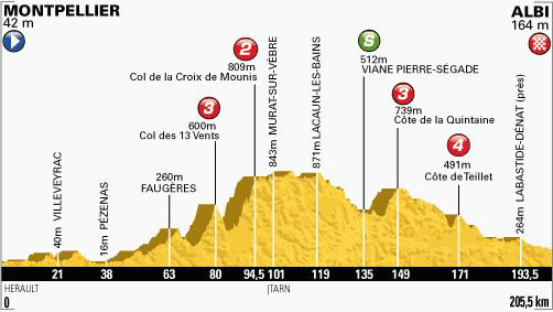 En este largo paso los ciclistas atacaran cuatro picos importantes: Marcigny (371 metros), Croix Couverte (614 metros), Thizy les Bourgs (536 metros) y Col du Pilon (727 metros).