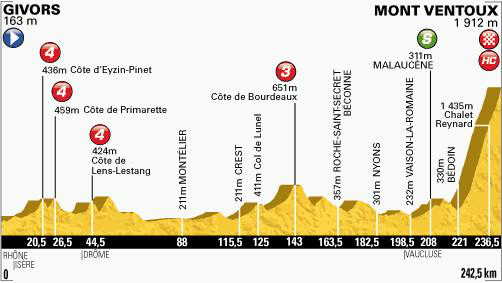 La etapa más larga de este tour. Después de correr 221 kilómetros, los ciclistas tendrán que atacar el Ventoux, 21,5 kilómetros de duro ascenso.