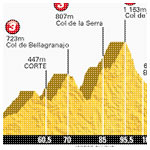 Tramo que se asemeja a una montaña rusa. Los picos de Bellagranajo (723 metros), Serra (807 metros) y Vizzanova (1.163 metros) son los desafíos a vencer.